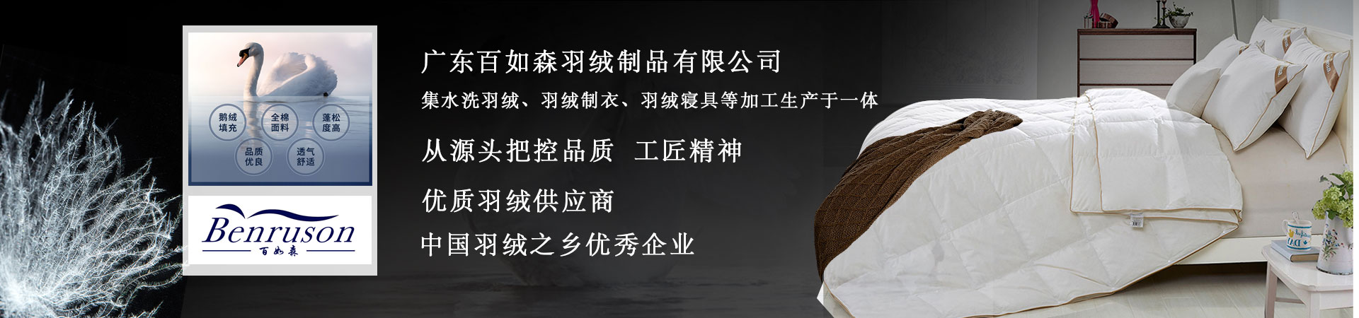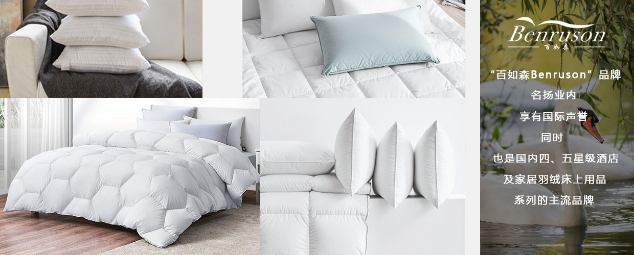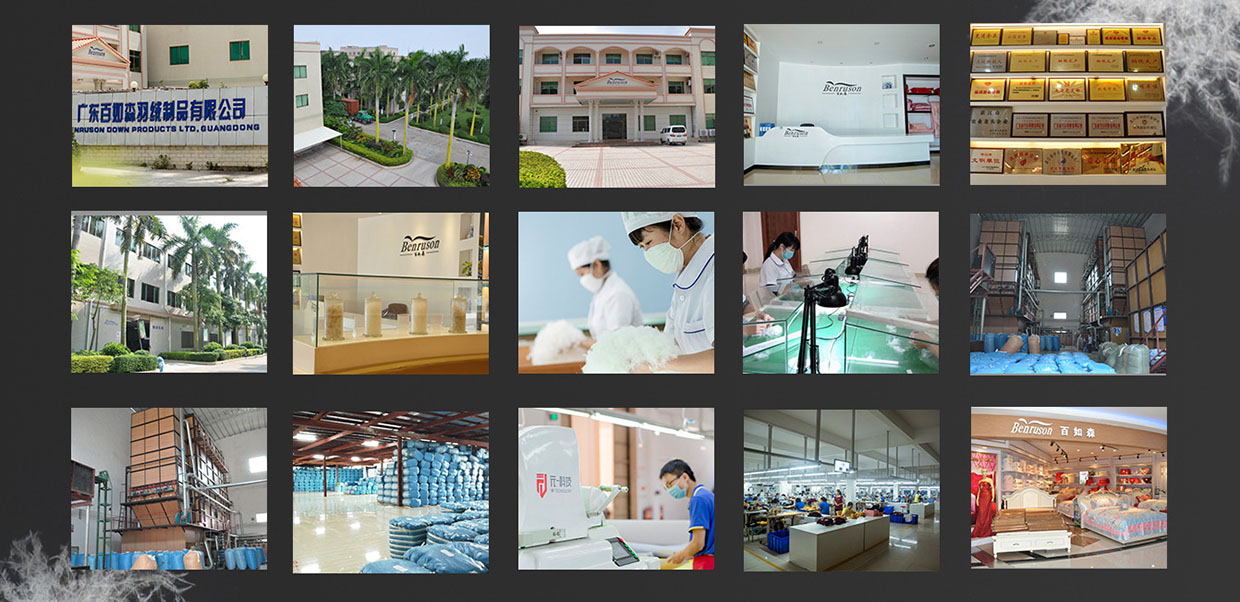 本公司座落于著名的“中国羽绒之乡”一一吴川市鉴江工业园B区,公司始于2004年,厂区占地面积35000平方米,厂房建筑面积53800平方米,全厂工人480多人,自动水洗生产线2条,五厢机、打包机、拼堆机等各种先进设备1000多台。公司以生产服装、床上用品、水洗羽绒、羽绒制品一条龙生产体系跨地区发展的大型企业。本公司“benruson”品牌被评为广东省著名商标,公司年生产能力:水洗羽绒(羽毛)4000吨,羽绒被及床上用品15万件(套),羽绒服装22万件,服装60万件。产品远销全球多个国家和地区,年销售额达1.4亿,深受好评。公司认真落实科学发展观,不断开拓创新,加强企业阵地建设,推动企业健康、快速发展,打造中国优质的羽绒产地。